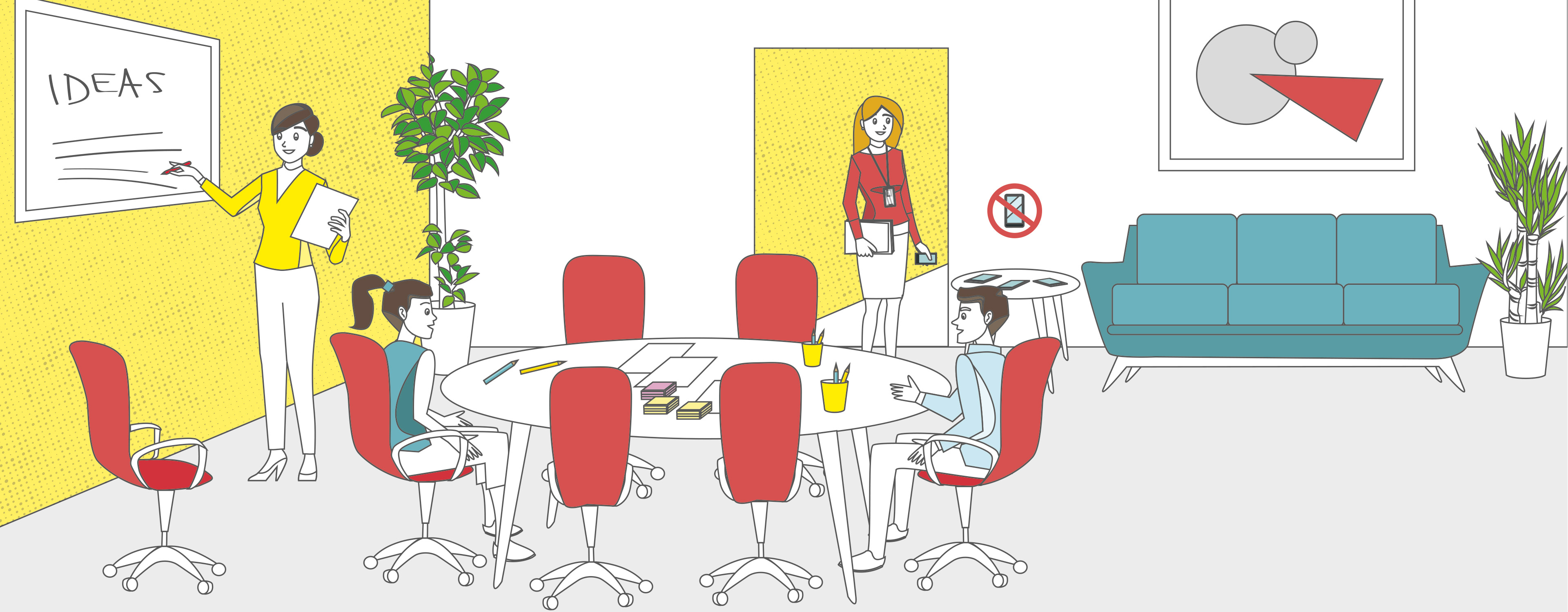 Sala konferencyjna jako główny element PRZESTRZENI SPOTKAŃ zawsze stanowiła epicentrum współpracy w firmie. Chociaż wciąż jest to miejsce, w którym pracownicy i przedstawiciele kierownictwa zbierają się, aby przeprowadzać prezentacje i podejmować decyzje, sala konferencyjna musi dziś pełnić dwie funkcje w kontekście przestrzeni do pracy. Białe tablice, duże karteczki samoprzylepne, montowane na ścianach telewizory i sprzęt telekonferencyjny są fantastycznymi narzędziami pomagającymi w przeprowadzaniu burz mózgów, udostępnianiu ekranów i łączeniu się z osobami spoza biura.